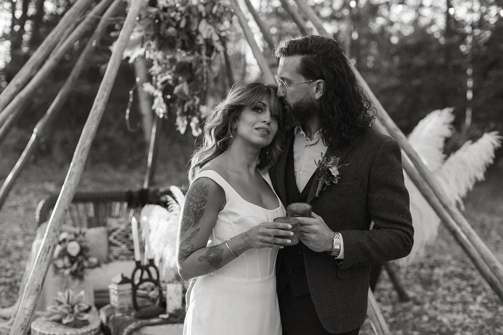 Under dreamy tipi poles with 200ft of lights and hanging eucalyptus garlands.