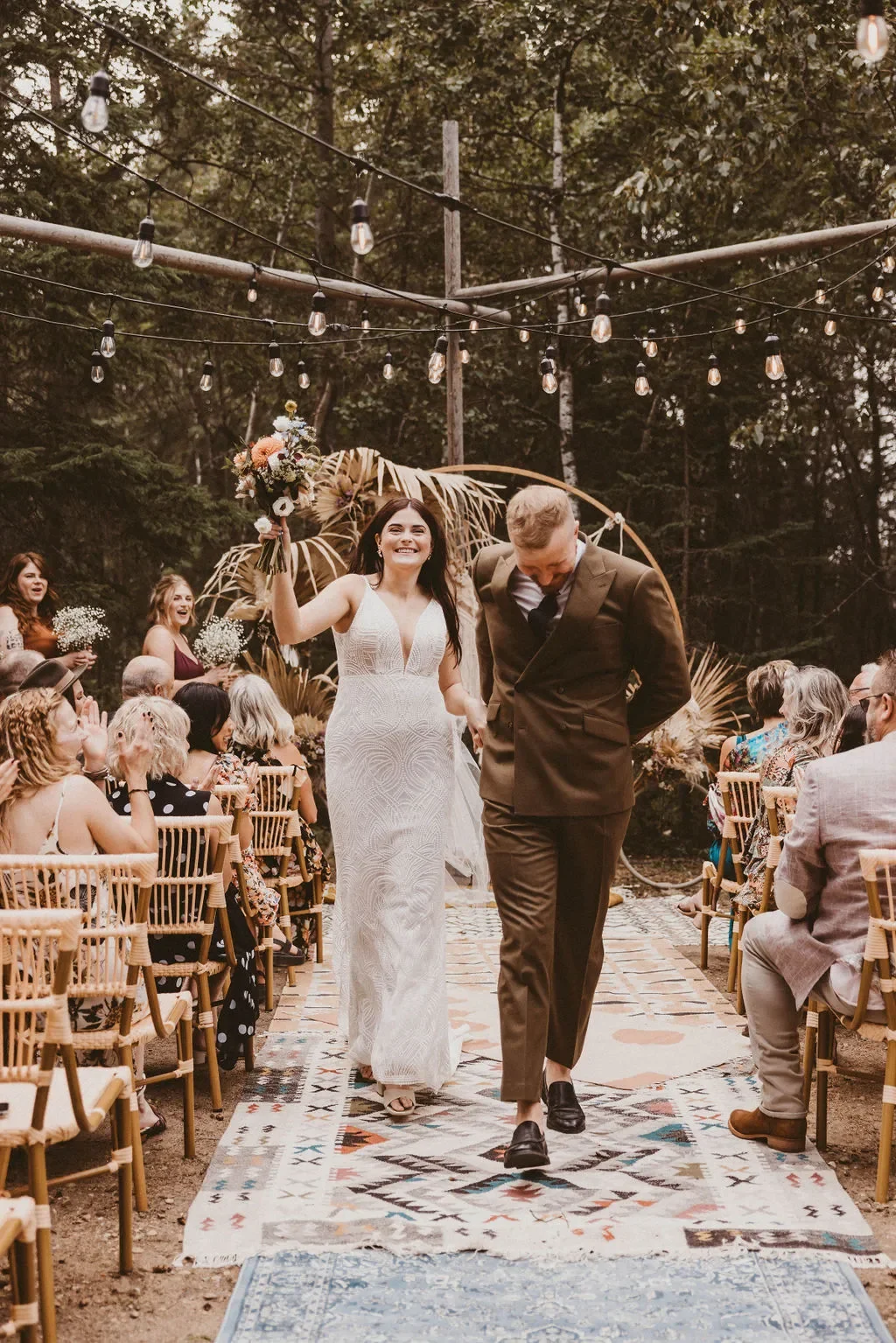 Boho rugs, pampas and accent decor framing the arch